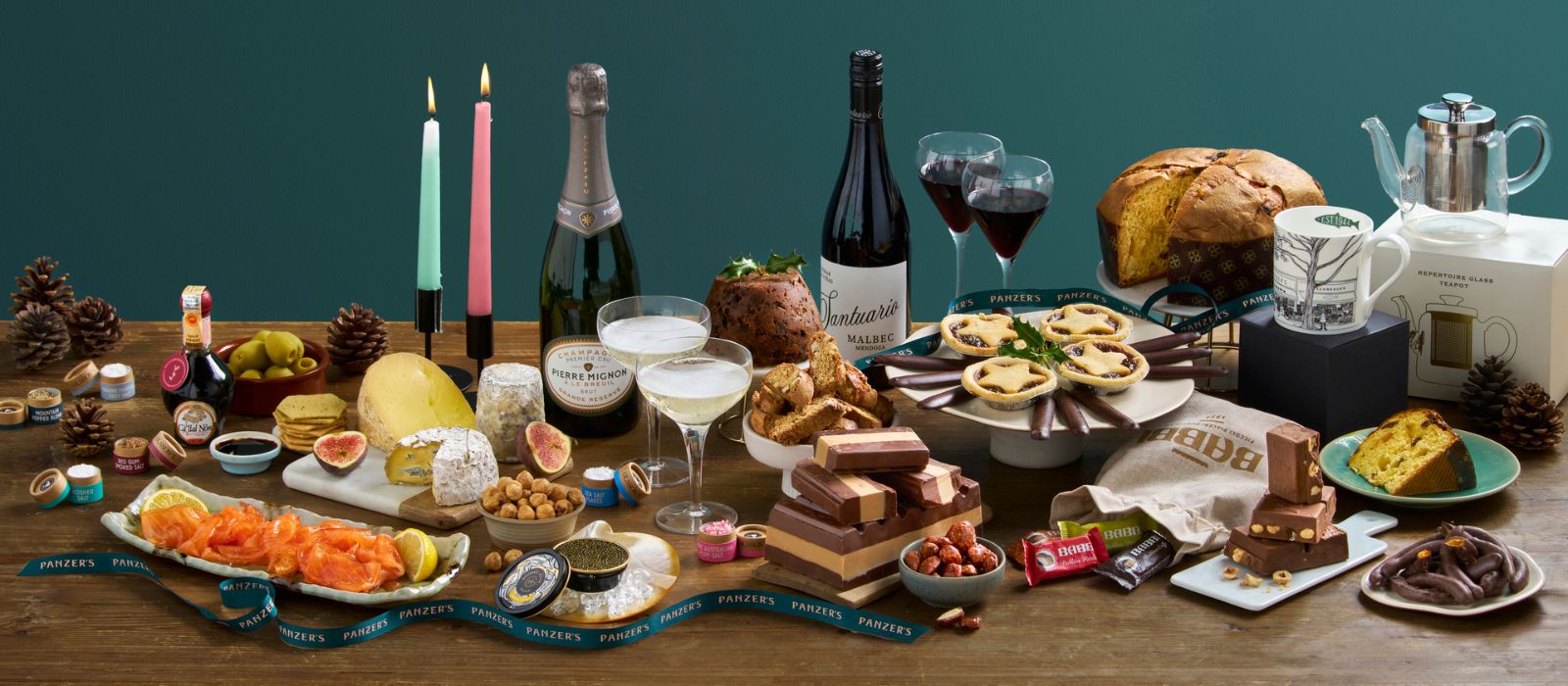 • Panzer’s Grand Epicurean luxury Christmas hamper — an opulent festive collection featuring smoked salmon, caviar, fine wines, artisan cheeses, chocolates, teas, and gourmet delicacies. Beautifully presented in Panzer’s signature green and pink packaging, this hamper from Panzer’s London is perfect for luxury Christmas gifting and celebrations.
