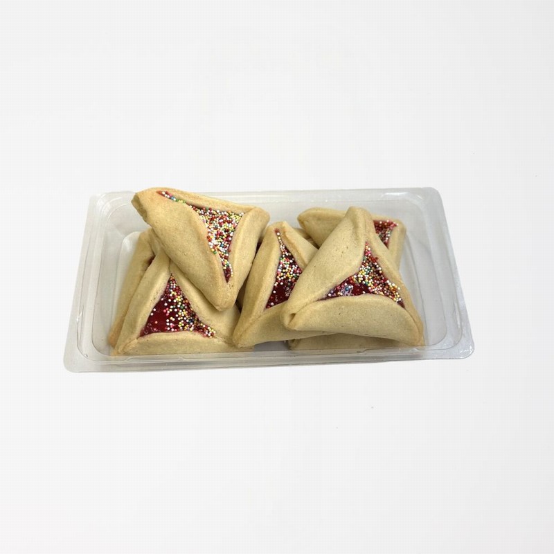 Delight in the sweet, flaky goodness of Just Baked Jam Hamantaschen Biscuit. Made with wheat flour, eggs, and rich fruit jam, these kosher treats are topped with colourful sprinkles for a festive, delicious bite every time.